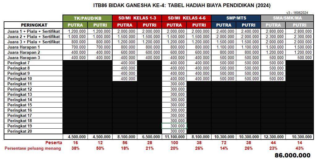 Dengan mempertimbangkan asas keadilan/fairness bagi seluruh peserta untuk berpeluang menjadi juara, dan juga berterima kasih atas masukan beberapa peserta/orang tua, pada tanggal 16/6/2024 panitia bersepakat untuk mengubah struktur hadiah juara ITB86 Bidak Ganesha Ke-4 dengan tetap menyiapkan dana total sebanyak Rp. 86.000.000