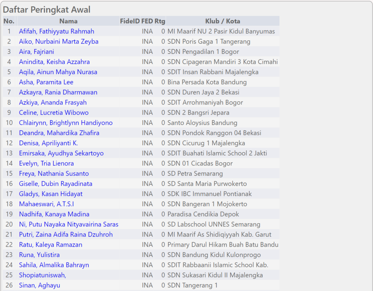 Hasil Pertandingan Kategori SD Kelas 1-3 Puteri :